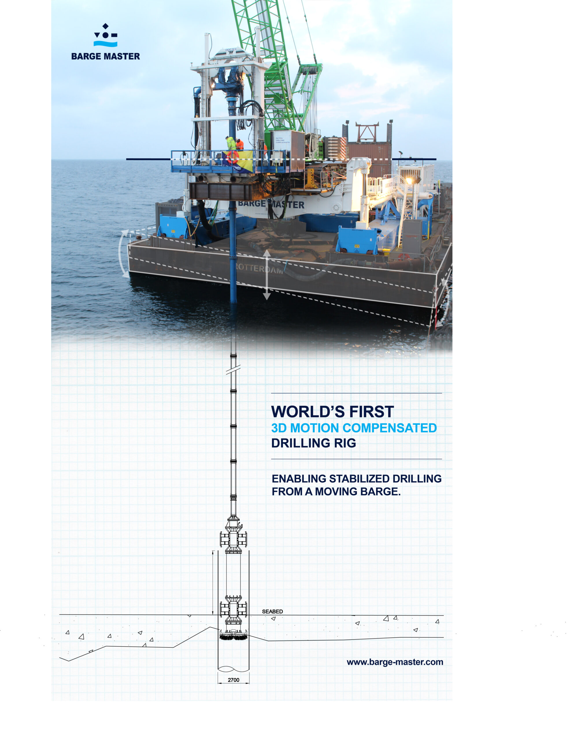 Boskalis used the 3D compensated drill rig for a wind turbine installation project. Large water depths, challenging soil conditions and an environmentally sensitive seabed made a floating solution the preferred option for the drilling operation. A team of engineers from Boskalis, DDC and Barge Master developed a modular set up for this delicate subsea drilling job. The modular solution consisted of a standard barge outfitted with a Barge Masters T700 motion compensation platform. The stabilized platform accommodated a drill rig, extended over the aft of the barge, and a crawler crane. The entire setup was mobilized within 2 weeks. Watch a movie of the project here.